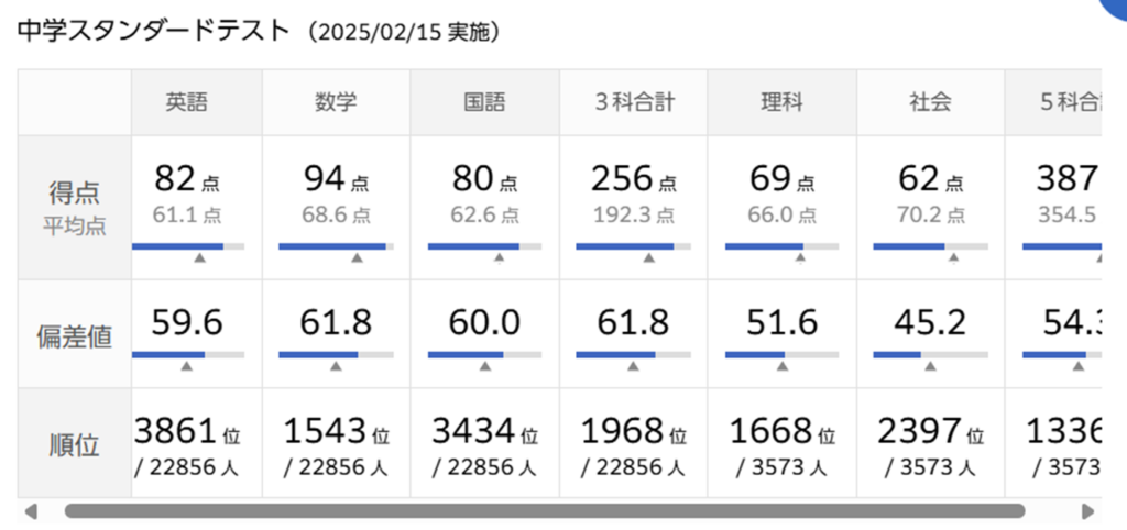中2 2月スタンダードテスト 2026 3/17 中2 2026年3月17日 スタンダードテストでは3科では偏差値60取れていて、息子もほっとした表情。 でも、特訓クラスの洗礼が忘れられず、息子の闘志に火がついていたようです。 「絶対に、特訓クラスに戻るぞ!」 そう、心の中で思い続ける日々を過ごしていたそうです。 中2 よかったらシェアしてね! URLをコピーしました! URLをコピーしました! 中2 1月駿台学力テスト 中2 2月難関チャレンジ公開模試 この記事を書いた人 sokeimama 関連記事 中2 3月必勝志望校判定摸試→特訓クラスへ昇格! 2026年3月17日 中2 2月難関チャレンジ公開模試 2026年3月17日 中2 1月駿台学力テスト 2026年3月17日 中2 1月特訓クラス・SKクラス選抜試験→そしてレギュラー落ち 2026年3月17日 中2 12月ハイレベルテスト 2026年3月17日 中2 12月難関チャレンジ公開模試 2026年3月17日 中2 11月駿台学力テスト 2026年3月17日 中2 11月特訓クラス・SKクラス選抜試験 2026年3月17日 コメント コメントする コメントをキャンセルコメント ※ 名前 ※ メール ※ サイト 次回のコメントで使用するためブラウザーに自分の名前、メールアドレス、サイトを保存する。